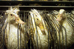 "Every year in France, 30.7 million ducks and geese are forced to ingest obscene amounts of food so that their livers swell painfully to up to ten times their normal size. Their diseased livers are then sold as ‘high class’ cuisine: foie-gras (literally ‘fatty liver’ in French). This is torture marketed as a delicacy – the pain and suffering of millions of birds forgotten amongst the clinking of glasses filled with fine wine. Other countries also produce foie-gras, including Hungary and China."