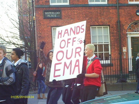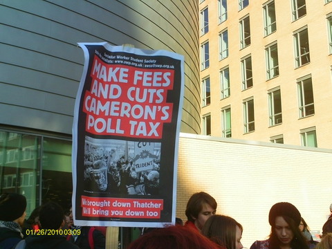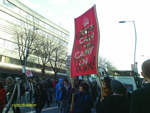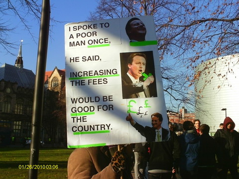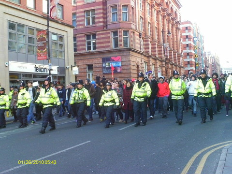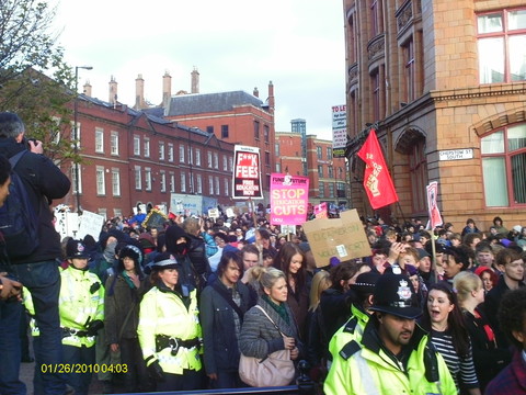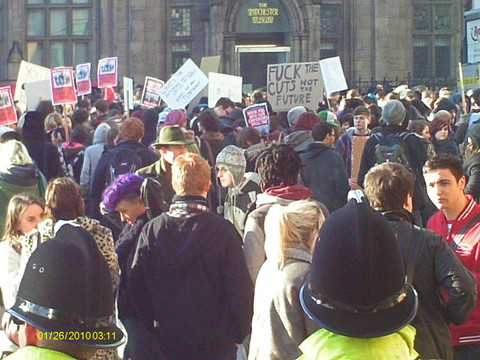 They collected first of all at two points on Oxford Road, near the University Students Union and the MMU. Many were carrying their own homemade placards, sheets of cardboard with pictures pasted on and humurous slogans written by hand: "Fuck It, I'm Moving To Scotland", "Fib Dems", "Don't Shaft Us, We're Not Samantha Cameron", "David Cameron: Keeping Students Sober Since 2010", "We're Used To Dealing With Shit But This Is Ridiculous - student nurses oppose public service cuts", "Throwing Fire Extinguishers Isn't The Answer - But Neither Is Big Signs" and one with a picture collage, the basis of which I can only suppose the owner got from a porn magazine, which showed Nick Clegg bending over and being, ahem, shafted by David Cameron.