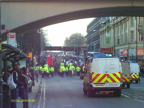 Shortly before 12.30 a hundred school students from Chorlton joined the march. And then it set off. Some blew horns, some danced along to the sound system, and when they passed under the first bridge across Oxford Street, where sound echoes beuatifully, they all raised a mighty cheer. The students got a thumbs up from all the BBC journalists who came out to watch, and to film them. They continued up Oxford Street but as it the march approached the town hall, it was dverted ands started to meander down back streets. This is a common ploy the police use with demonstrations, they endorse a route that will keep the march as much out of sight as possible. Apparently the march was supposed to end at the town hall, but the police had decided they wanted it to end at Castlefields. Not everybody agreed, and when the march was passing the Museum of Science and Industry some students started shouting, "To the town hall, to the town hall" and suddenly diverted right past the museum entrance. About a thousand students followed them. The press of bodies was so close at that point that it took a few minutes for the police to push through and at that there were only two of them. One pointed down the street towards Castlefields and said "The speeches are that way!". More students walked right past him going in the direction of the town hall. There were now effectively two marches.