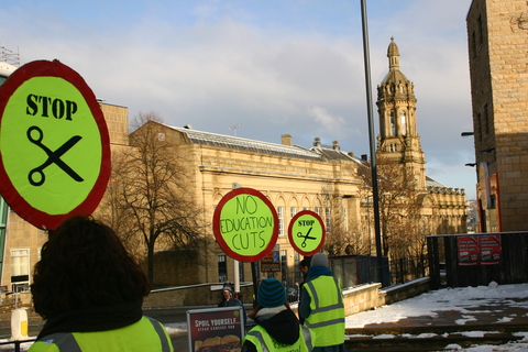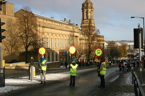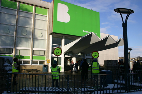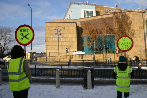Today Bradford met a new kind of lollipop lady. The Lollipop Ladies of Education dashed around Bradford highlighting the need for society to resist the proposed government cuts to education. At pelican crossings, libraries and educational institutions around Bradford the Lollipop Ladies (and Men) stood firm. Accompanied by students handing out leaflets, the Lollipop Ladies reminded us all that the young people of today will be bearing the brunt of these cuts. For them education will no longer be a right, but a privilege. Look forward to seeing you next time.
