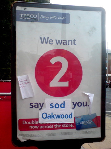 Corporate criminals Tesco had one of their posters improved last weekend to more accurately reflect their attitude to the community of Oakwood, where they are planning a huge expansion to their existing supermarket. The poster (observed at 1800h on Saturday 22nd August 2009 outside Rico's restaurant, Oakwood) had been amended to read, "We want 2 say sod you Oakwood." Their planning application is due to be heard on Thursday 27th.