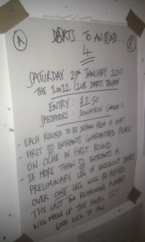 Saturday 29th January 2011 saw the 4th Annual "Darts to an end" tournament held at the 1in12 club in Bradford which drew competitors and spectators from across the North of England. The much revered silver cup was won in theatrical style amid a haze of buckfast and cocktail fuelled shenanigans, which more than made up for the slightly more low key nature of this years event.