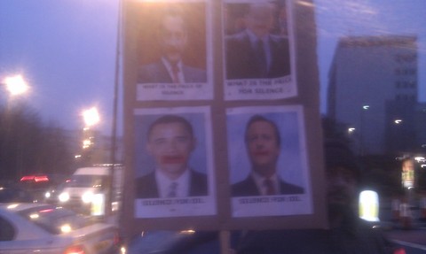 One held up a sign with pictures of various western heads of state including David Cameron, Nicolas Sarkozy and Barack Obama, red tape placed over their mouths. One of the protestors pointed to the sign and explained: