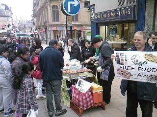 One lady commented "I didn't think it was possible to make cake without egg but that was delicious!", several promised at least to reduce if not to give up eating meat, and with a face full of the free treats, none begrudged taking a moment to peruse some literature explaining the vegan rationale.
