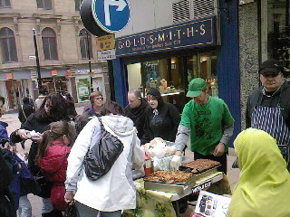 In conjunction with Veggies Vegan Catering Campaign, a group of animal rights activists took to the streets to offer Bradford shoppers a free taste of the alternative to McRubbish and KFCrap. Supported by a compelling arsenal of pizza, burgers and various cake - all made with the finest ethical (including strictly vegan) ingredients - the case was pitched for a kinder, more environmentally friendly and healthier diet.