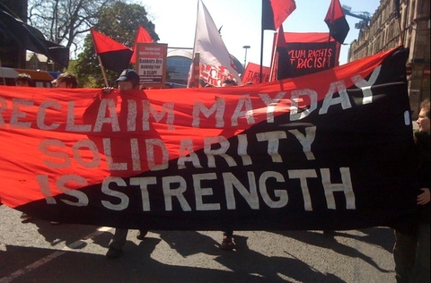 There was a highly visible and lively Anarchist Bloc on the Tyne and Wear TUC May Day March in Newcastle on Saturday 30th April. Elsewhere on the march, interesting banners and placards were present from a wide range of groups.