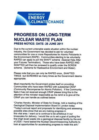Most importantly the Government prides itself on providing Communities who have been RAPED, with substantial CRAP (Community Recompense for Atomic Pollution). If the Community feels it has not received enough CRAP please bring this to the attention of the minister responsible as his remit is to give all the CRAP you can handle as outlined below: