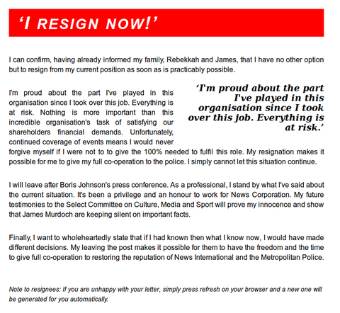 With the recent spate of resignations from senior Metropolitan police figures and News International employees, we decided to make it easier for others to jump before they are pushed. Introducing iresign.org.uk - the automatic resignation letter generator!