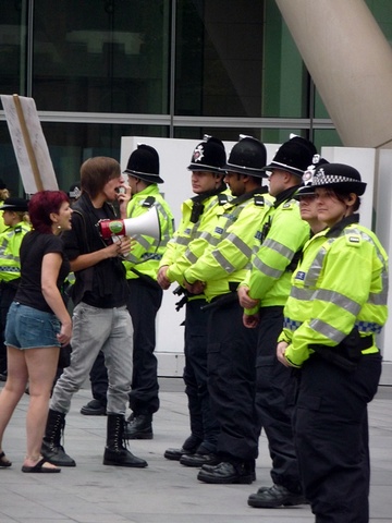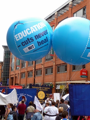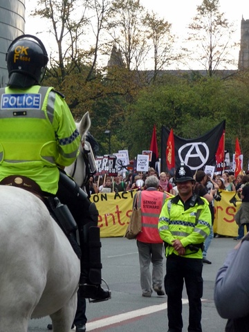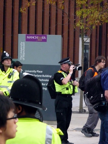 Today tens of thousands marched in protest at the tory party conference in manchester. A feeder march from the university started around 12.30pm after speeches setting out the reasons for the occupation of albert square and future dates for mobilising resistance to the cuts and the con-dem coalition. It joined the main protest which noisily snaked its way around the tory party conference centre. There was a huge amount of anger expressed by marchers with many saying they were inspired by events in other countries and were preparing to support the block the bridge action in london on 9th october, the education demos on 9th nov and the strikes on 30th Nov.