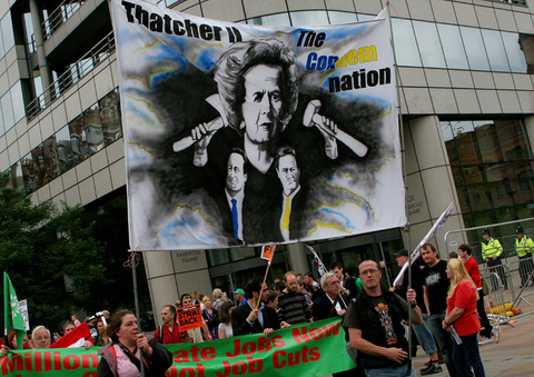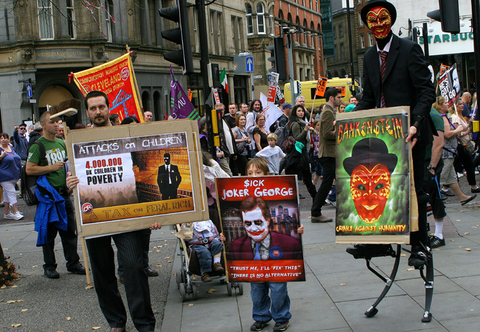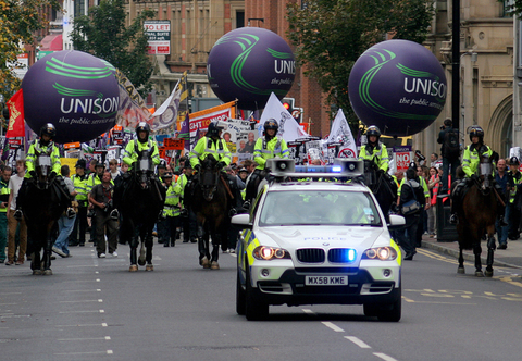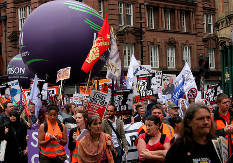 Unions organised a rally of 35,000 protesters against government budget cuts on Sunday in Manchester.