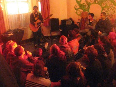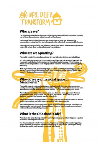 Manchester's OKasional cafe has returned. The temporary squatted social centre project has occupied a disused old people's home in Fallowfield, South Manchester. For three weeks the space will provide vegan lunch, dinner, workshops, events, gigs, parties, a library and more.