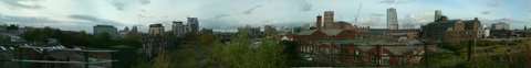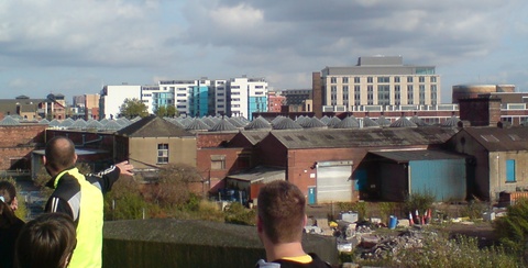 Having come as close as we could get to the city centre by this route, the panorama of the skyline tells a story. We listed several of the misconceived high-rise developments, largely unoccupied, which sprang up in the few years before the crash. Much of this development was fuelled not by people's need for housing, but by speculation and a desire to make a profit. There were to have been several new tall buildings, but most of them have been cancelled. The ones that were put up tell a sorry story - Bridgewater Place, aerodynamically designed to be a hazard to passing cyclists, and City ("sh**ty") Island, a cluster of unwanted, overpriced, vacant properties. These follies stand alongside those of a previous era, the Italianate towers of Tower Works; although they were designed to demonstrate the cultivation of their owners, their real purpose was to extract dust from the mills below. Similarly with today's tall buildings, the race to build ever higher was driven by the needs of capital, not of human beings. As with the mills, these were to be machines for the efficient reproduction of capital.