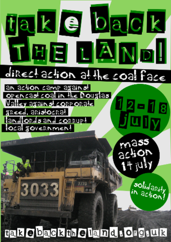 Opencast coal mining in the Douglas Valley is about the ruling class destroying communities for their own financial gain. Its about ecological destruction on a massive scale for capitalism’s unquenchable thirst for cheap energy. Its about absentee fat-cat land-lords making millions off land that shouldn’t be theirs. Its about morally corrupt local (and national) government putting profit before people. Join us 12-18 July in the Douglas Valley, South Lanarkshire, to build on 20 years of community struggle and four years of direct action against the UK’s biggest opencast mining company. It’s time to Take Back the Land!