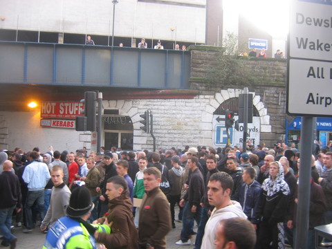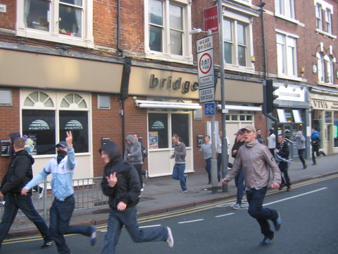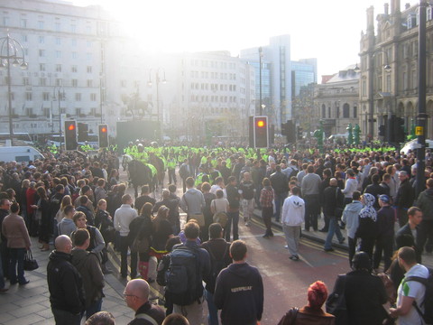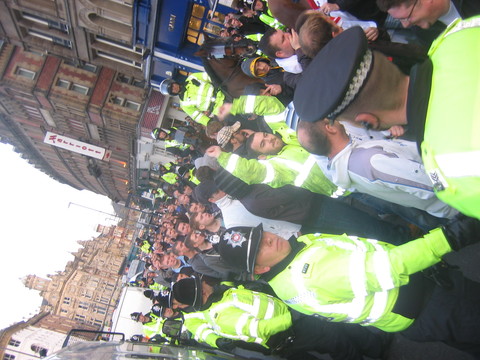 At 15:50, the EDL were let out of the kettle and herded towards the station, but a large group broke free and ran down underneath the station, followed by police. The police tried to contain them but they ran on and dispersed. Eventually, a group of 150 EDL supporters were escorted by police down Boar lane and to the station. The police formed a kettle around them, and there was no chanting to be heard by now. The police and let out 4 at a time into the station. A group of up to 100 disparate anti fascists followed the fascists to see them off on their trains and coaches.