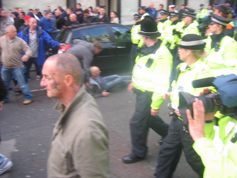 The crowd outside was more mixed. It was mainly pro EDL, but there were about 150 anti fascists, who were mainly from Leeds, bundled in there as well. The outnumbering of the antifascists may largely be down to the fact that hundreds of UAF protesters were being kettled up by the art gallery on the Headrow.