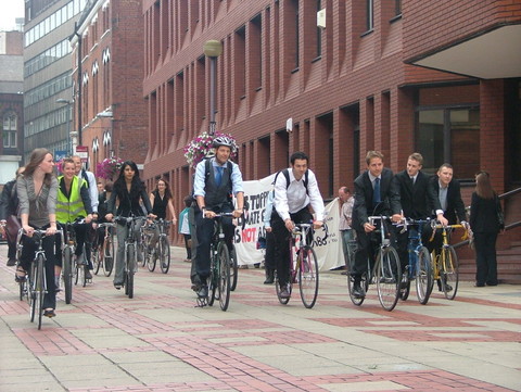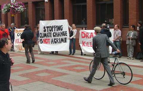 The defendants are unable to discuss the bizarre strictures imposed on their defense until after the trial. They arrived by bicycle at Leeds Crown Court today. A large crowd gathered outside to show their support, with banners saying, "Burning coal is killing us," "Stopping climate change is not a crime," and "Drax power station kills 180 people per year."