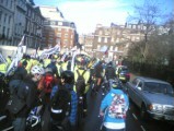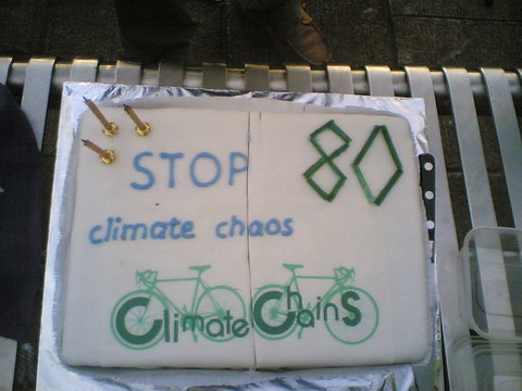 The bikers have now arrived at Trafalgar Square where Climate Camp is in the process to being pitched. There are two tripods up, one of them occupied by someone with a transparent umbrella. A 6x4m kitchen tent has been erected and people are chopping vegetables within. About ten pop-up tents are about and bike generator for power. There are at least two Northerners there, and possibly more nearby. There is talk of occupying the site for up to two weeks. Spirits are high and there hasn't been much harassment. Banners are showing "Stop Climate Chaos" and messages critical of the COP15 process.
