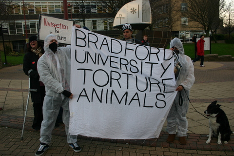 In Bradford, anti-vivisectionists held a noisy and visual demo at the University of Bradford to draw attention to their ongoing animal testing programme which has become under growing pressure to stop.