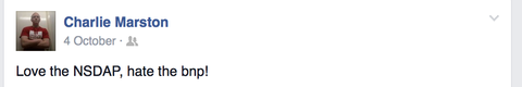 Stephen is in the National Front though unlike usual suspects Stephen is openly and actively a neo-nazi who supports Nationalism Socialism, idolises Adolf Hitler, NSDAP and White Supremacy.