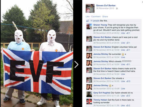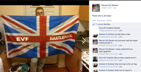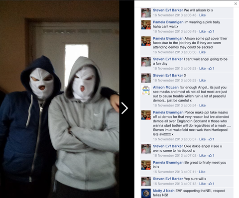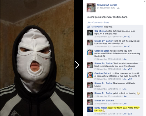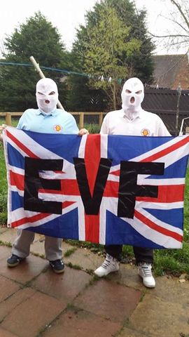 Today also unmasked are members of the EVF (English Volunteer Force) in the North East of England ‘North East EVF’. So far it seems they’re mostly concentrated mostly in Hartlepool and consists of little more than a few nut jobs posing masked up in their house and garden.