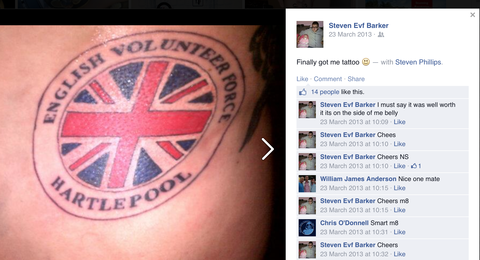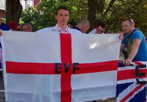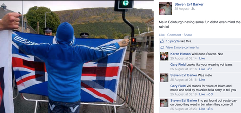 Political History:- Stevens known to of supported and been involved with both the NF and the EDL since 2012. Also the NEI and EVF since 2013. He seems to be one of the more active members of the EVF having banners made and t-shirts printed. Notably Steven gave a speech at the Berwick NEI demo. He often tries to cover his face and be in photos only showing his back to the camera.