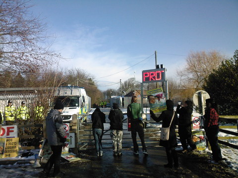 At the gate of the complex, the company had set up a neon sign with the words "Protest Zone" on it. All activists arriving were issued with a section 50 notice by the police (stating that the scene has had reports of antisocial behaviour), which required all attendees to give over their personal details under threat of arrest. A heavy local police presence of around 70 was swelled with some from Scotland Yard. The usual FIT tactics were used against the protestors.