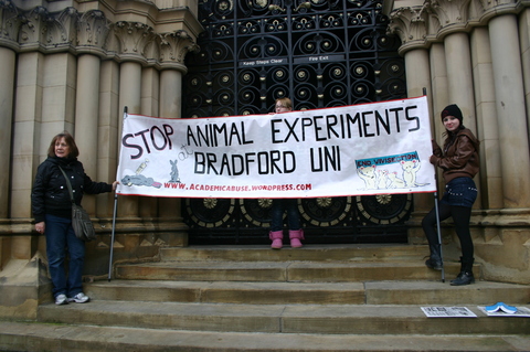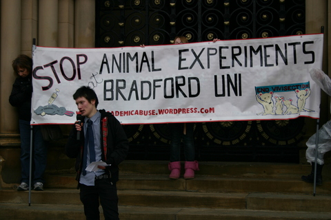 Over 100 people turned out at Bradford University to protest against the animal testing which continues there.