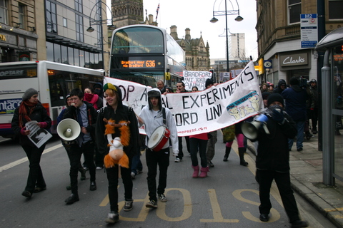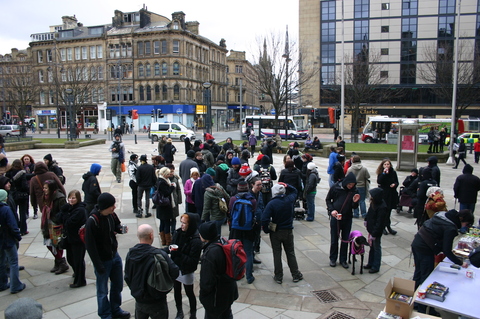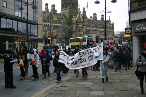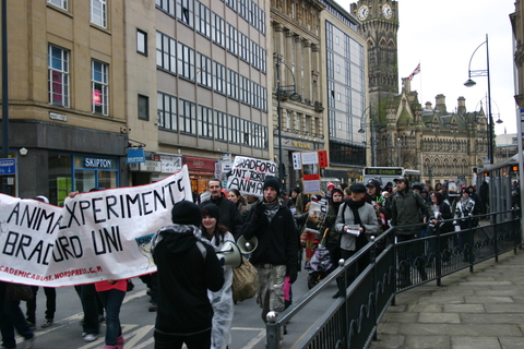 At 12pm on Saturday 13th February, 2010, between 100-150 Animal Rights activists gathered at Centenary Square in the centre of Bradford to protest against the use of animals for experimentation at the University of Bradford.