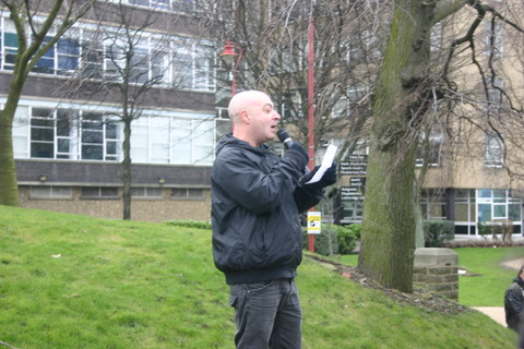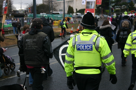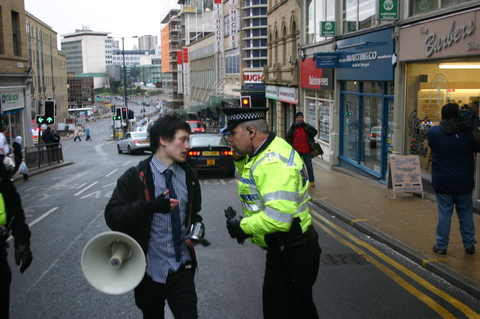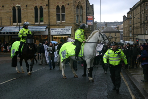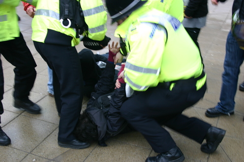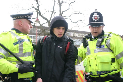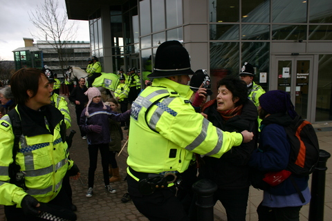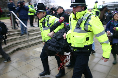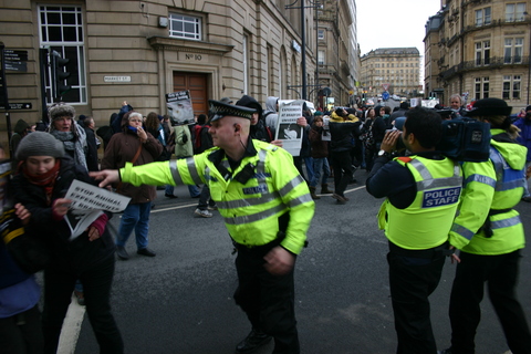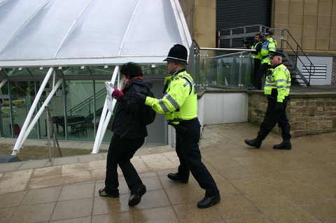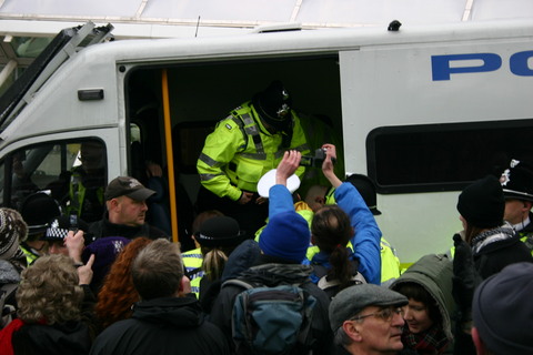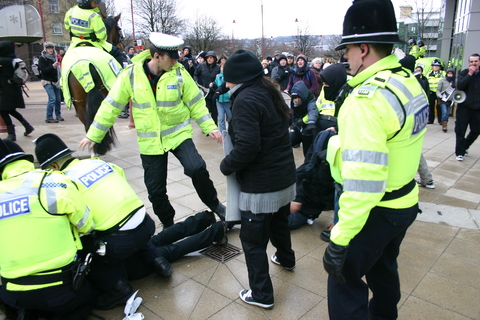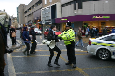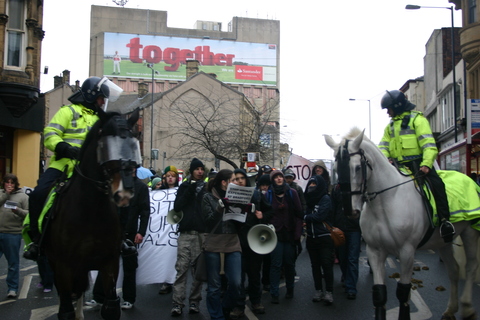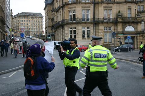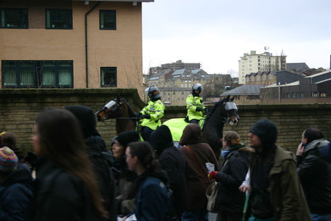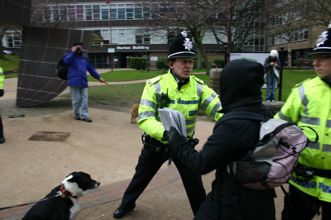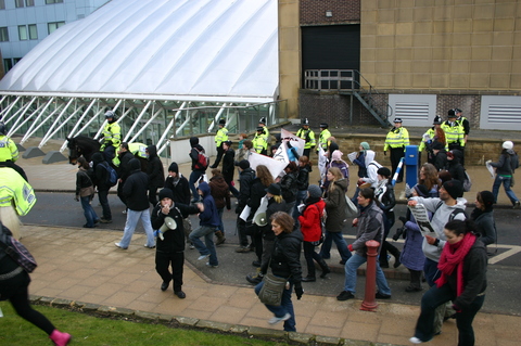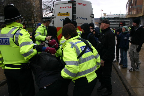 A march through the streets and up to the University building witnessed several arrests and what many regarded to be heavy handed policing tactics, as protestors were prevented from handing out leaflets to the public on several occasions and two were arrested for attempting to obscure the view of the FIT (Forward Intelligence Team) cameraman who was trying to film people attending the legal demonstration. Several small skirmishes ensued causing a high level of tension between the Police and demonstrators.