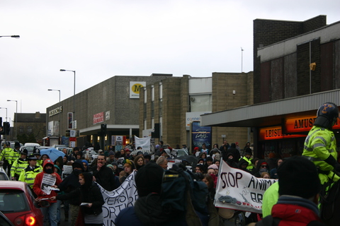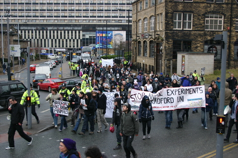 The group congregated in centenary square at 12pm with a rally and then began a march around the city centre at 1pm which moved through the centre to the Broadway development, soon to be Bradfords 'Arts Hole' [5], where two protestors obscured the FIT [Forward Intelligence Team] [6] cameras with posters . Moving up to the Oastler market the protest then went down past TJ Hughes, near here one protestor reported on twitter that they were pushed by police officer number 8333, and then the media museum to make way up Great Horton Road to the main University campus.