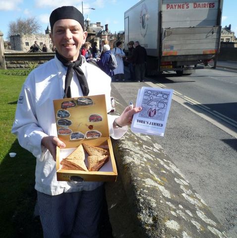 Members of York's Jammed held a jam packed flash mob at a traffic hotspot in York on March 27th. The jam themed action drew attention from crowds of passersby and car drivers as dressed as waitresses, chefs and 1950s housewives we offered jam sandwiches and jam tarts as an alternative to traffic jams.