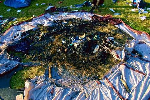 On the second day, a new set of volunteers joined the effort and there was still much remaining to collect. Whilst many of the tents had been destroyed by previous scavengers and beyond repair, the volunteers were still able to collect another vanload of equipment on the second day.
