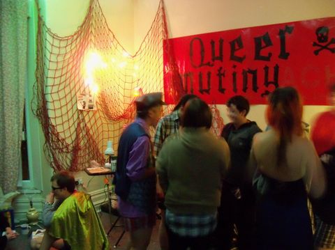 Using an abandoned building for an event was a political statement and it helped keep the cost low so the event could be run on donations only and open to all. The organisers set to work building cinema seats, putting up decorations and making the space comfortable. The films were shown in a cinema on the ground floor, with food and kitchen also being on floor level making the space accessible to wheelchair users. Queer Mutiny groups exist all over the UK and have a strong DIY ethic which fits in with squatting. Instead of asking people to pay landlords or asking the council to provide space a DIY response is to take a space that is currently abandoned and turn it into something useful, to not simply consume but to challenge and take control themselves.