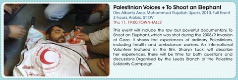 This event will include the raw but powerful documentary, To Shoot an Elephant (2009), which was shot during the 2008/9 invasion of Gaza. It shows the experiences of ordinary Palestinians, including health and ambulance workers. An International Volunteer featured in the film, Sharyn Lock, will describe her experiences. There will be time for both questions and discussions. Organised by the Leeds Branch of the Palestine Solidarity Campaign.