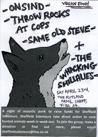 Acoustic punk from Onsind, Throw Rocks At Cops, Same Old Steve & The Whacking Shilllalies + vegan food, to raise funds for Sheffield Saboteurs.