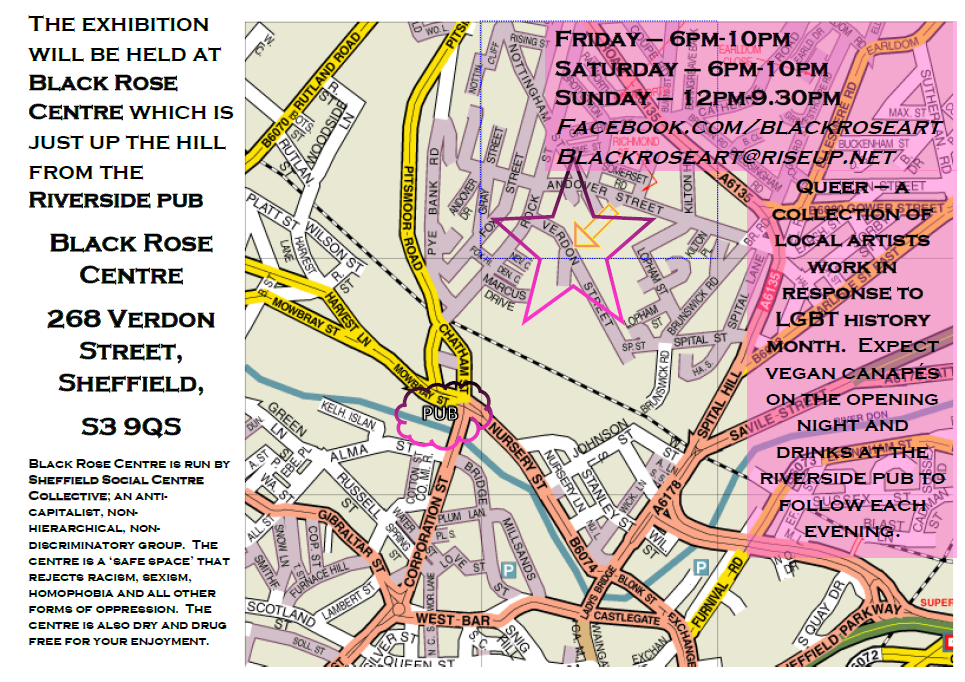 QUEER: an exhibition of local artists' work in response to "LGBT History Month" and the first event to be held at The Black Rose Centre, let's make it a good 'un!