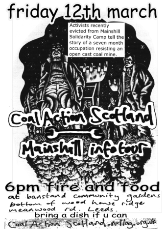 Activists from mainshill solidarity camp tell the story of a 7 month occupation resisting an open cast mine.... with fire and food at bandstand community gardens, bottom of woodhouse ridge, meanwood rd. bring a dish if you can.