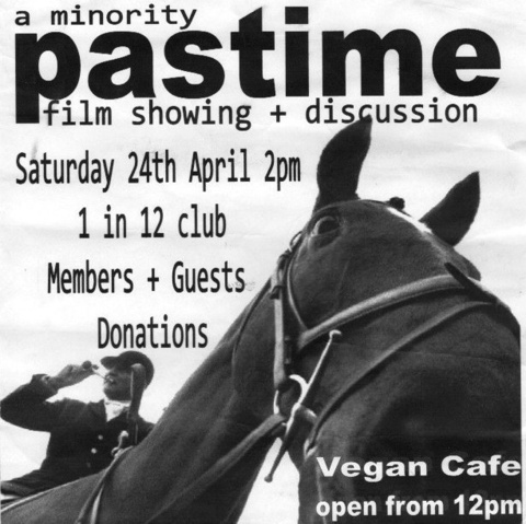 A new film is being released about fox hunting, called "A minority pastime". For more information on the film see the website http://www.aminoritypastime.net/ West Yorkshire Hunt Sabs and Bradford Animal Rights will be showing the film in Leeds and Bradford to raise money for the West Yorkshire Hunt Sabs. http://westyorkshirehuntsabs.wordpress.com/ Bradford, The 1in12 club (21-23 Albion Street, BD1 2LY), Sat 24th April. 12.30pm - Vegan Brunch, Film showing at 2pm. Their will be information about hunt sabbing, brunch, cakes for sale, and a raffle!